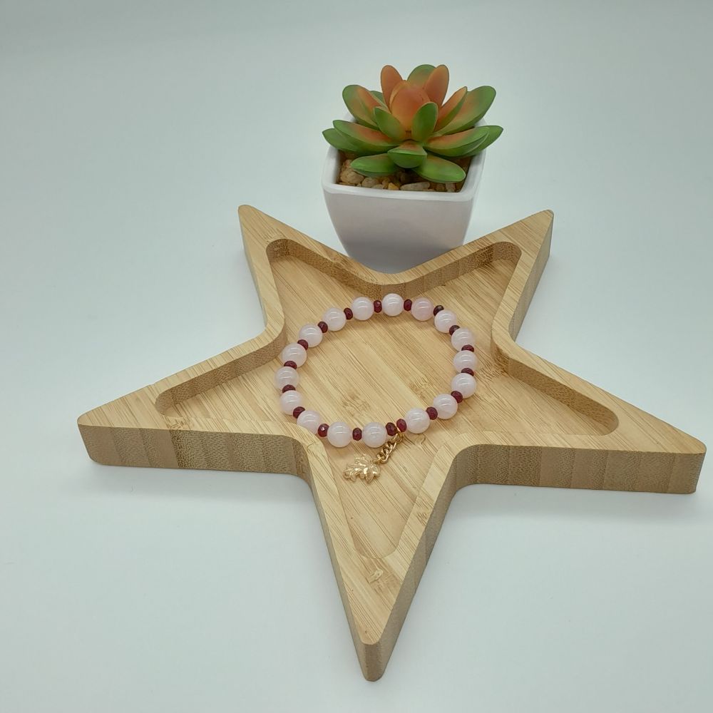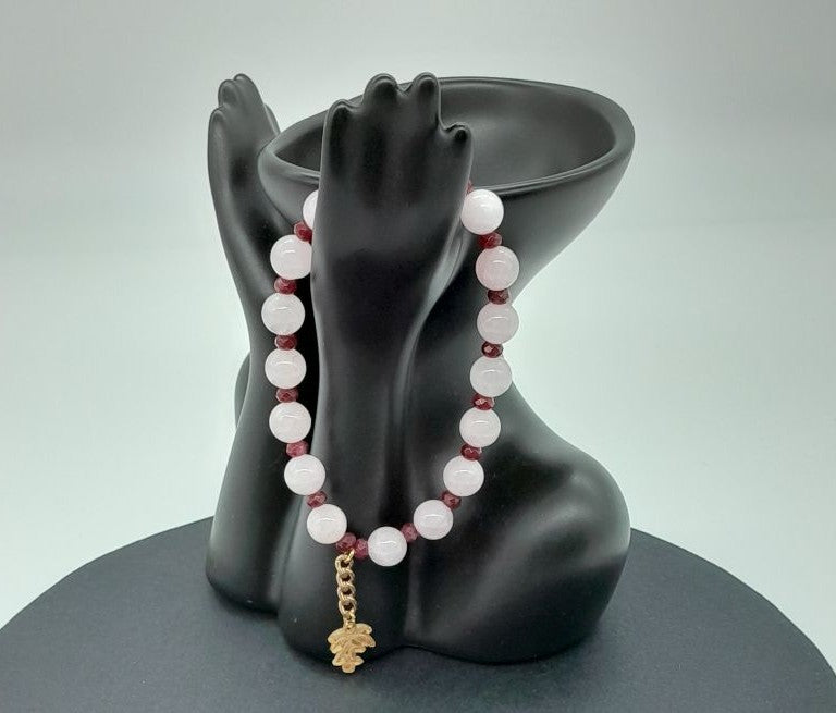 Bracelet fait main en perles Quartz rose Ø 8mm avec intercalaires rouges Ø 4mm en cristal, montées sur fil élastique