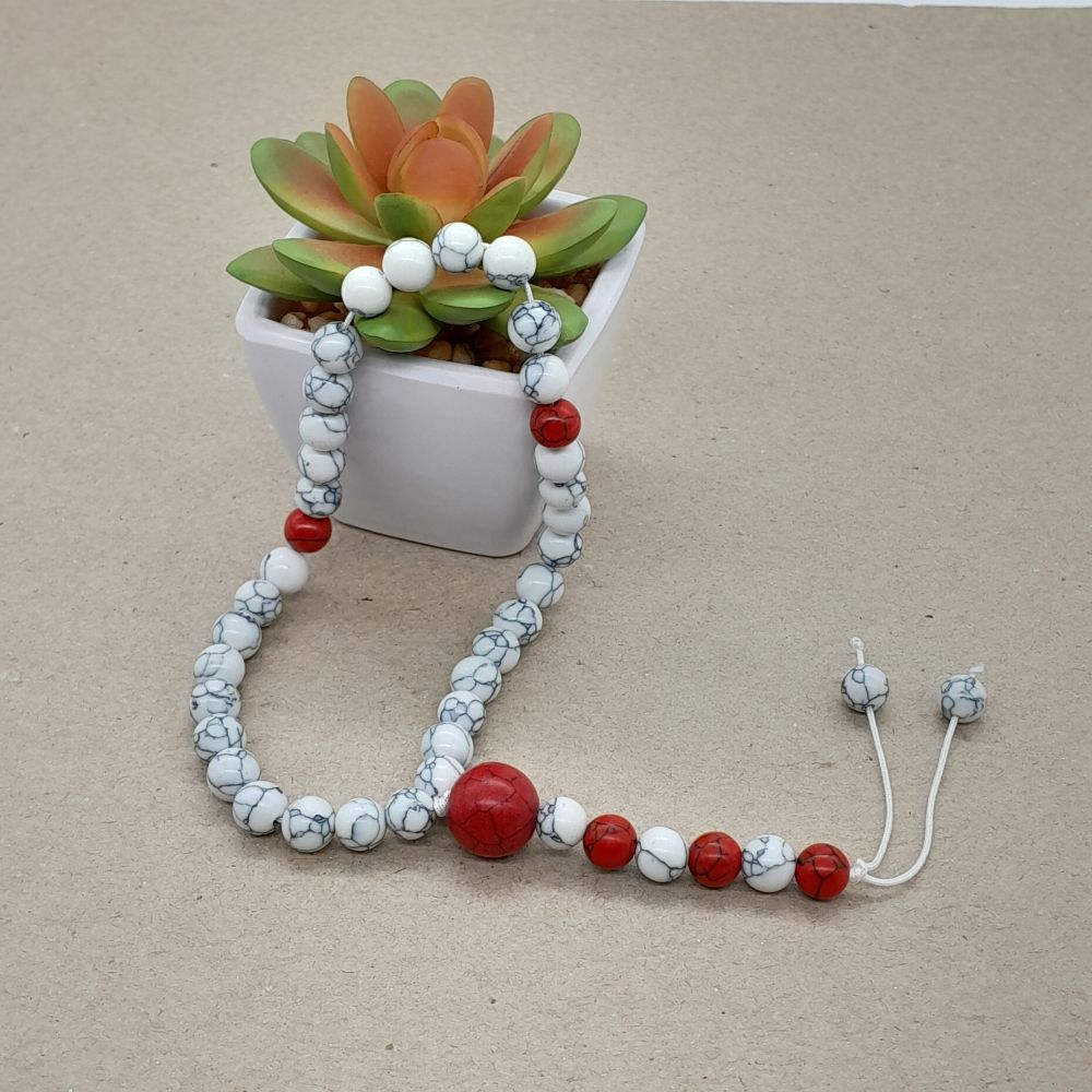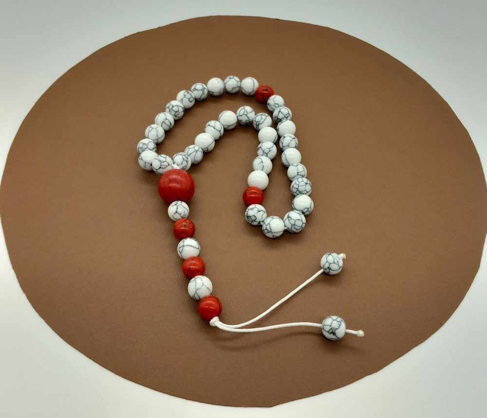 Chapelet Tasbih Traditionnel 33 Fait main Composé de 3 x 11 perles de Howlite blanche Ø 8mm avec séparateurs de Turquoise rouge Ø 8 & 10 mm + un cordon central